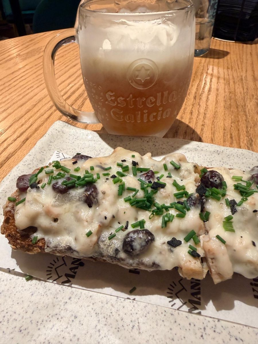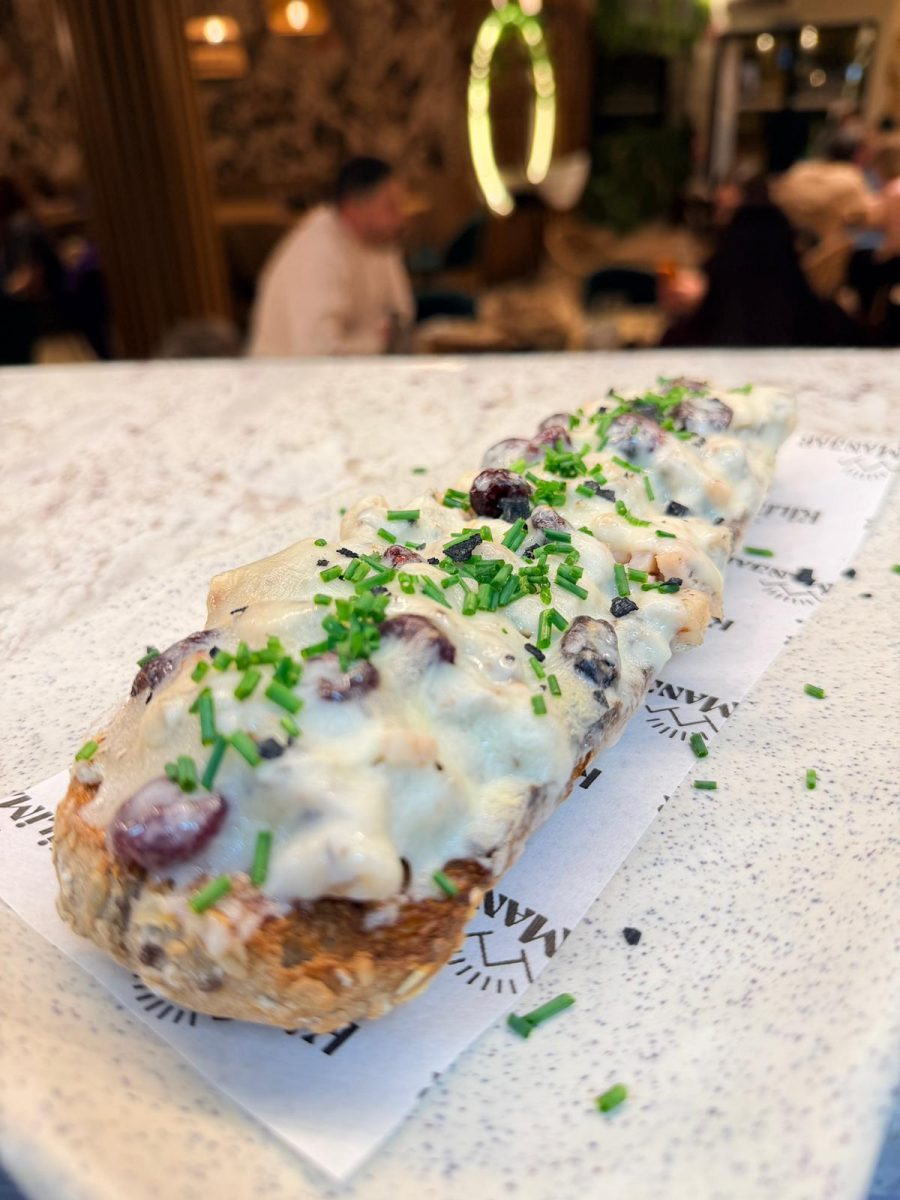 Una base de guacamole con pollo trufado, arándanos, queso fundido, cebollino y sal negra.